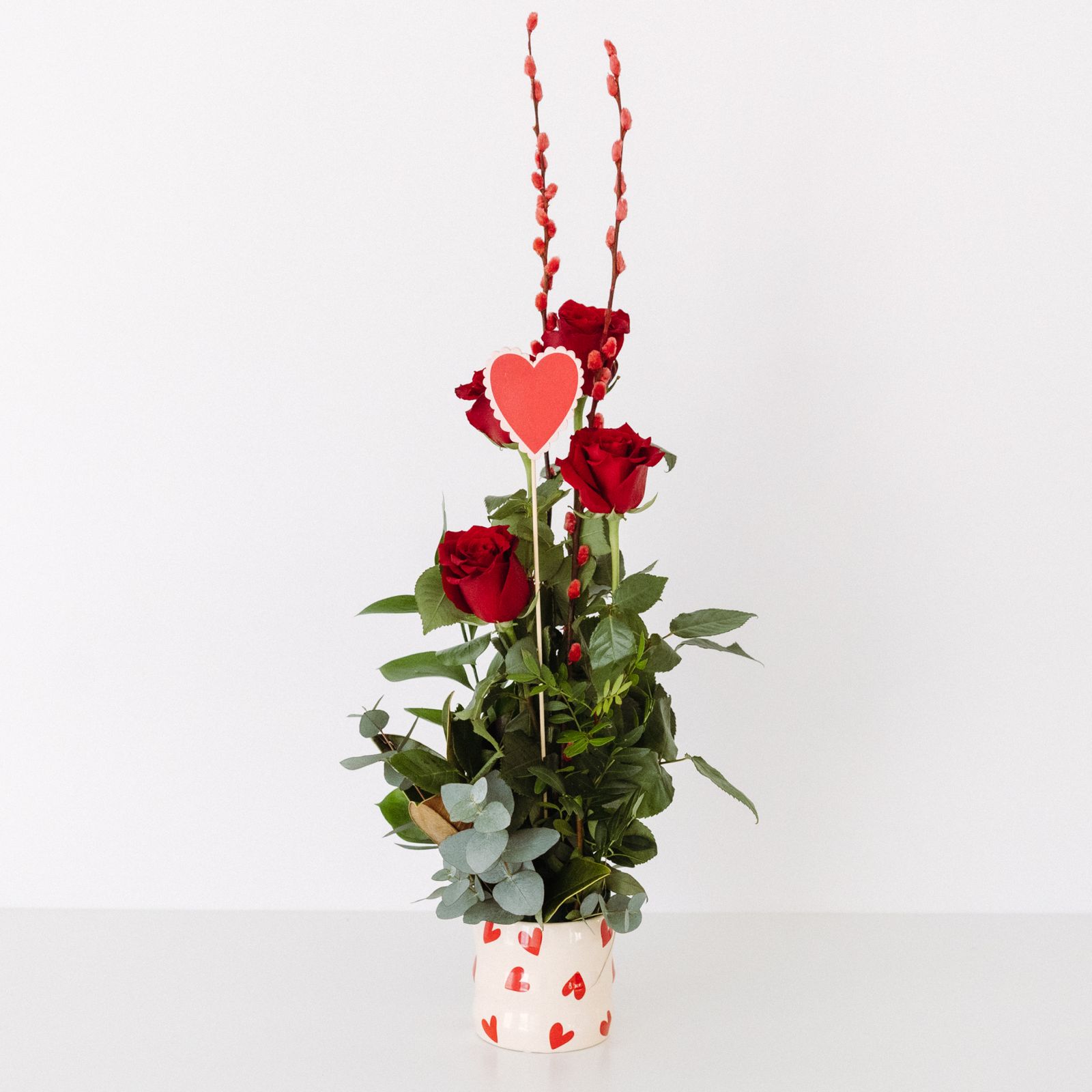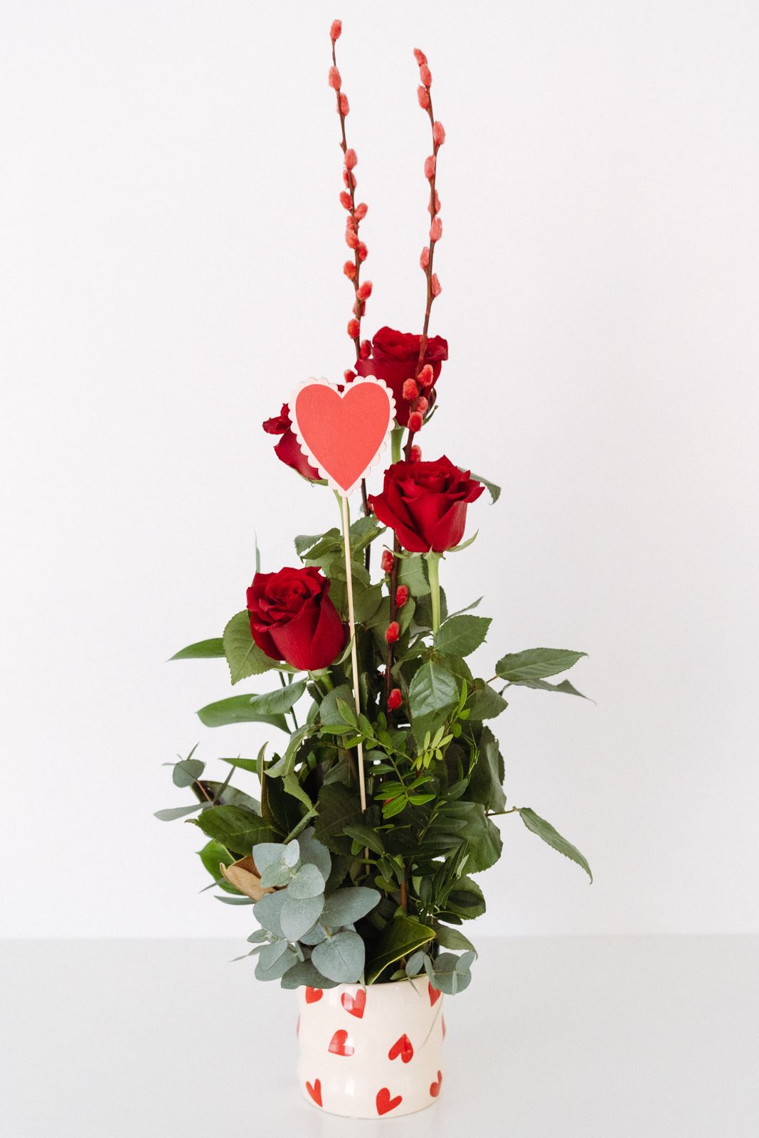 Quatre roses vermelles, posades en test de ceràmica amb cors vermells, un detall.